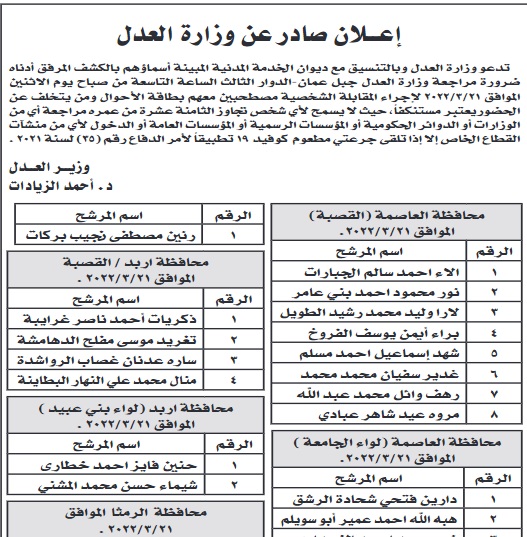 الرئيسية تعيينات حكومية دعوة مرشحين لاجراء المقابلات الشخصية لغايات التعيين في وزارة العدل الاردنية - اسماء 17.3.22 (0) الأقسام تعيينات حكومية جميع الوظائف وظائف في الاردن تويتر واتساب بنترست لينكدين تمبلر لاين بريد أنسخ الرابط أخر المواضيع من قسم : تعيينات حكومية تعليقات ليست هناك تعليقات إرسال تعليق