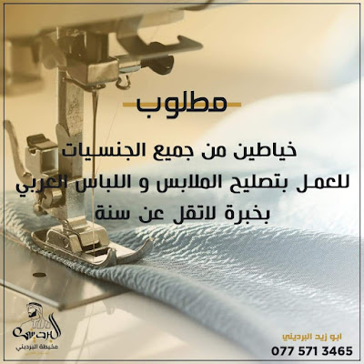 مطلوب خياطين من جميع الجنسيات للعمل بتصليح الملابس واللباس العربي بخبرة لا تقل عن سنة