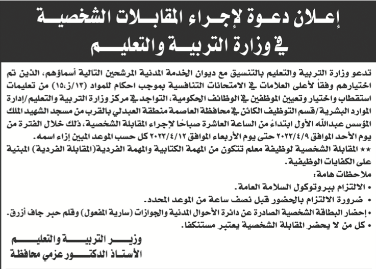 الرئيسية تعليم وتدريب تعلن وزارة التربية والتعليم عن دعوة عدد من المعلمين والمعلمات من كافة المحافظات لاجراء المقابلات الشخصية وذلك لغايات التعيين 5.4.23 (0) تعلن وزارة التربية والتعليم عن دعوة عدد من المعلمين والمعلمات من كافة المحافظات لاجراء المقابلات الشخصية وذلك لغايات التعيين الأقسام تعليم وتدريب تعيينات حكومية جميع الوظائف وظائف في الاردن تويتر واتساب بنترست لينكدين تمبلر لاين بريد أنسخ الرابط أخر المواضيع من قسم : تعليم وتدريب تعليقات ليست هناك تعليقات إرسال تعليق
