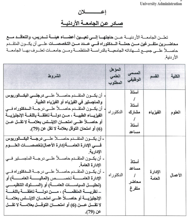 تعلن الجامعة الأردنية عن حاجتها إلى تعيين أعضاء هيئة تدريس، والتعاقد مع محاضرين متفرغين من حملة الدكتوراه على أن يكون المتقدم حاصلاً على جميع شهاداته الجامعية بالدراسة المنتظمة ومن جامعات تعترف بها الجامعة الأردنية.